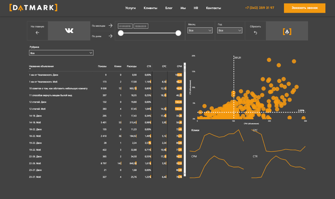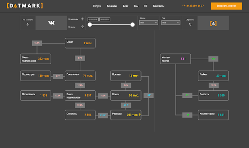 Отдел аналитики за две недели разработал систему дашбордов. Теперь в течение пары секунд мы получали информацию по эффективности любой записи в сообществе, смотрели динамику эффективности рекламной кампании и объявления и предсказывали, каких результатов ожидать в ближайшее время.