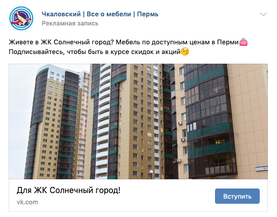 - Реклама на только что вступивших в сообщества по ремонту, мебели, интерьеру и другим близким к мебели тематикам;