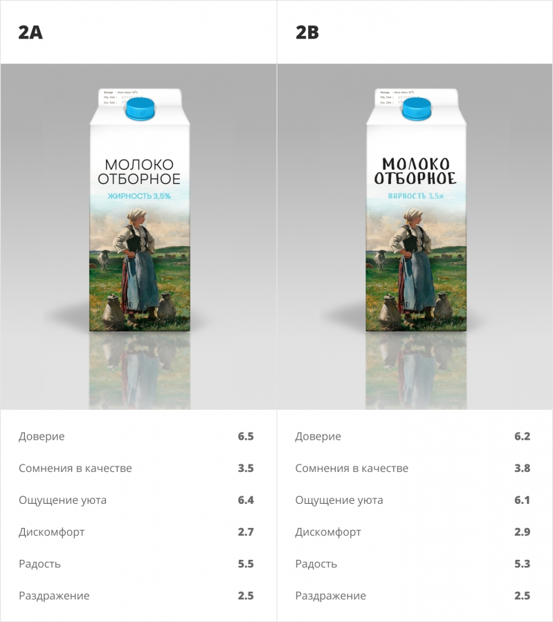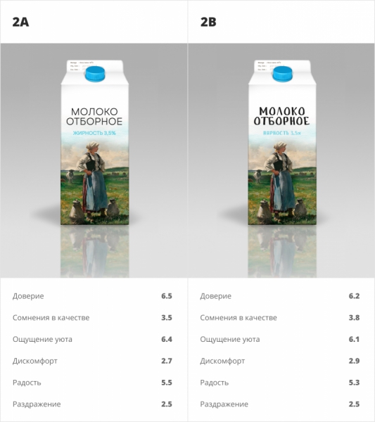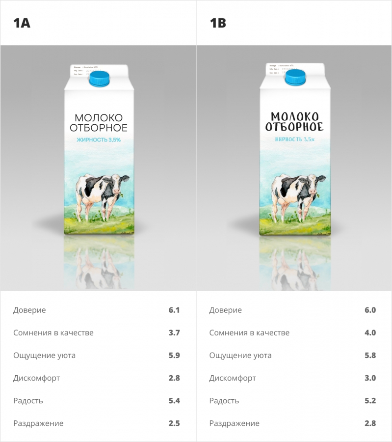 Однако мы обнаружили, что выполненные в одной стилистике упаковка молока с изображением человека воспринимается лучше, чем упаковка с коровой. Так, средняя оценка ощущения уюта, которое вызывает упаковка 2А, больше на 0,5 балла, чем упаковка 1А, и на 0,6 балла больше, чем упаковка 1B. Разница в средней оценке доверия между упаковками 2А и 1В также составляет 0,5 балла.