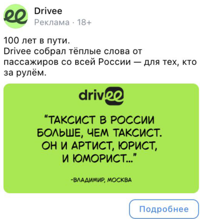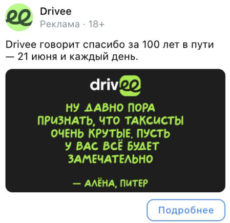Мы предложили вирусный формат промо для рекламной кампании, чтобы усилить ее «человечный» смысл. Вирусные инструменты в брендовом оформлении Drivee превратили наружное промо бренда в широко-охватную историю в интернете — охват составил 23 млн. 404 тыс. Нативные инструменты усилили идею и превратили ее из рекламы в честные, теплые слова от реальных людей.