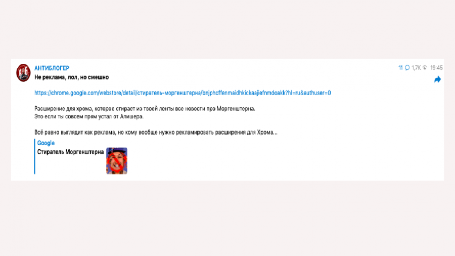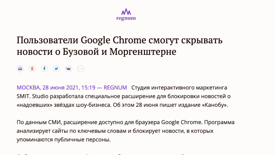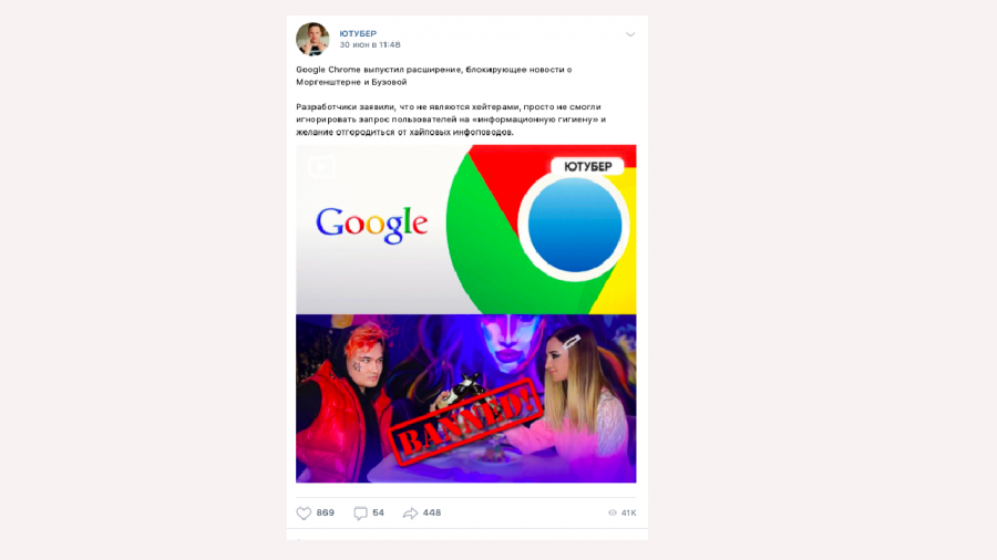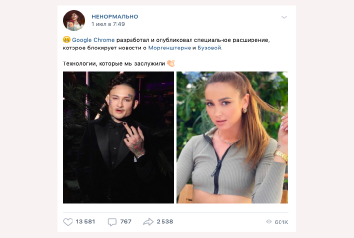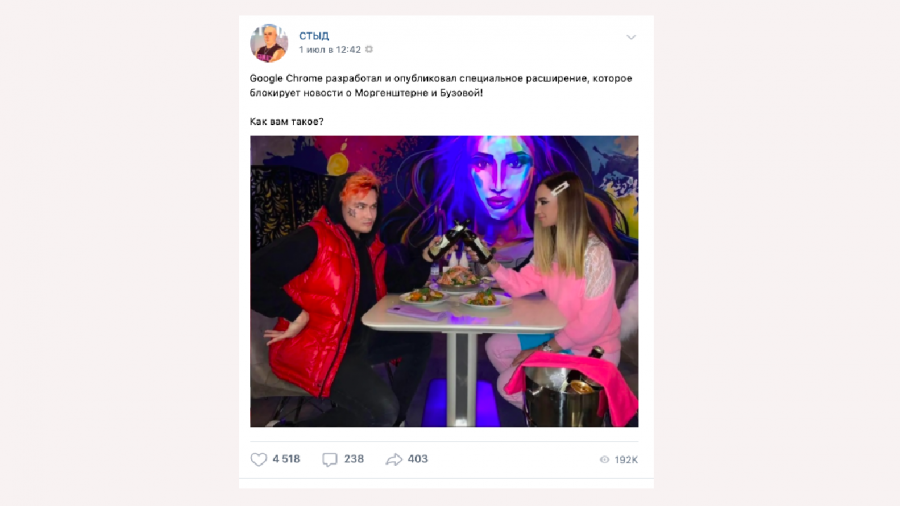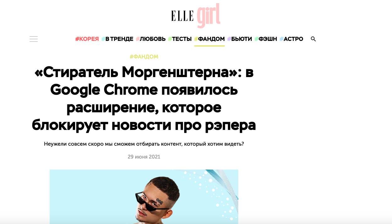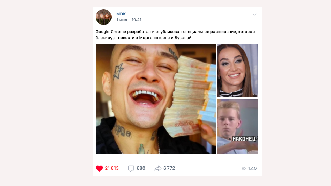 Про расширение для Chrome, которое «стирает» из интернета упоминания о Моргенштерне и Бузовой, недавно писали крупнейшие онлайн-издания, печатные газеты, вещали радиостанции, постили в соцсетях — от MDK до региональных филиалов «Подслушано», вызывая многокилометровые треды с обсуждениями. Всю эту волну запустила
