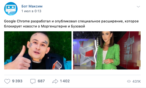 Почти полмиллиона просмотров набрал паблик «Бот Максим».
