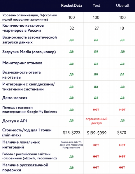 Сравнение основных параметров сервисов Uberall, Yext, RocketData
