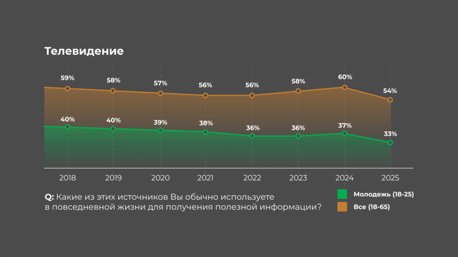 По данным Mediascope молодежь проводит в интернете на 12% больше времени, чем возрастная группа от 25 до 34 лет (Источник: Mediascope Cross Web, янв-мар 2025). Однако, это не оказывает влияния на рост запоминаемости рекламы. Возможно, это связано с тем, что молодежная аудитория в большей степени абстрагируется и закрывается от рекламы в интернете. У молодежи самый высокий процент установленных adblock'ов: 54% против 37% в среднем. Также в связи с блокировкой крупных площадок, в целом, наблюдается снижение значимости социальных сетей, как источника полезной информации для молодежи (падение началось в 2022 году).