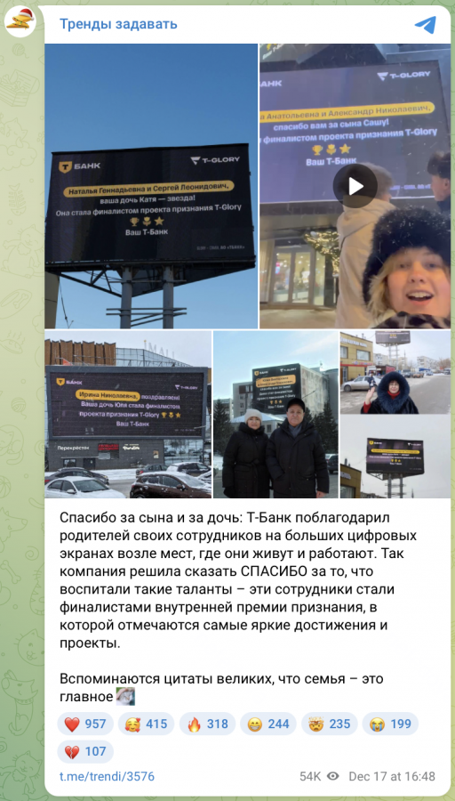 В разных городах России появились публичные обращения, адресованные финалистам внутренней премии «T-Glory» и их родителям — людям, которые поддерживали участников на всем пути к профессиональным достижениям. Об этом Sostav рассказали представители компании