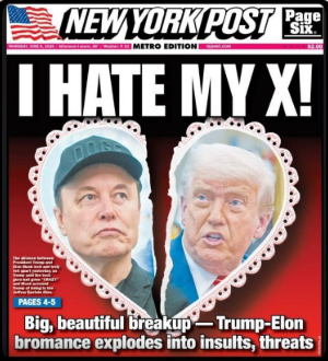 Конфликт с Трампом обошелся Маску в $34 млрд за один день, пишет Bloomberg. А New York Post разместила на своей обложке фото Трампа и Маска в разбитом сердце с подписью I hate my X.