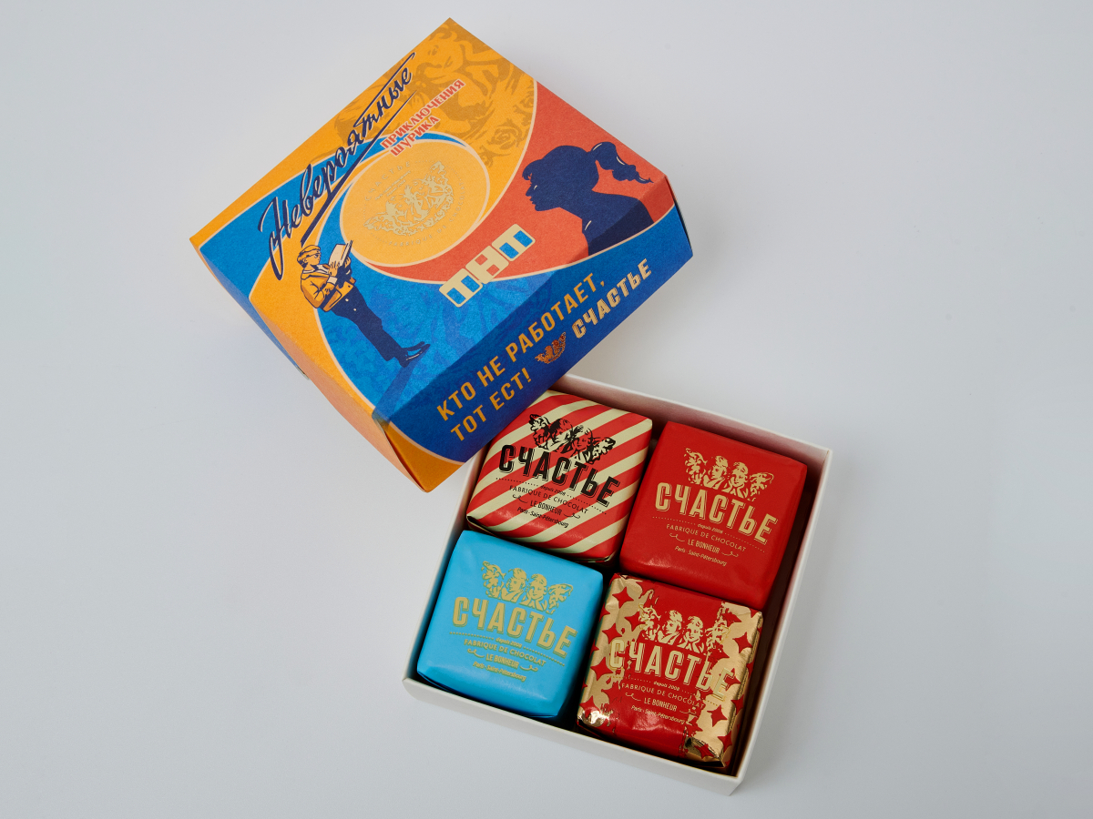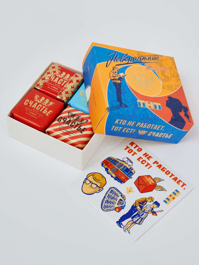 Если жизнь — это коробка шоколадных конфет, то открывать ее нужно с улыбкой и вдохновением. Поэтому в СЧАСТЬЕ мы очень внимательно относимся к деталям: у каждой коробочки есть своя история. В работе над этой коллаборацией мы вдохновились афишей «Операции “Ы” и других приключений Шурика»: сохранили тот самый советский флер, но мягко адаптировали под наш почерк. А фраза «Кто не работает, тот ест!» — игривое переосмысление знаменитой реплики, которое хочется сделать маленьким девизом наступающих праздников.