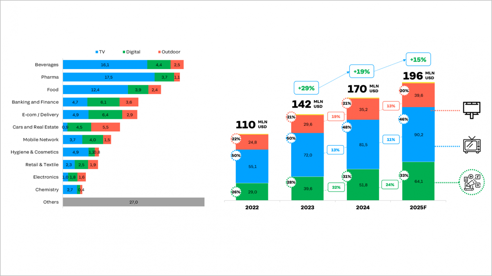 ТВ-реклама все еще остается медиа № 1 в Узбекистане с точки зрения инвестиций и проникновения. Быстрый набор охвата (свыше 30 млн телезрителей по стране) и расширяющиеся возможности инвентаря привлекают крупные бренды с широкой республиканской дистрибуцией. При том, что главными категориями, для которых ТВ является основным медиа, остаются FMCG и фармацевтика, нельзя не отметить растущее присутствие на ТВ и цифровых продуктов (например, финтех, e-com, доставка еды и другие), для которых телевидение выполняет роль медиа для построения доверия.