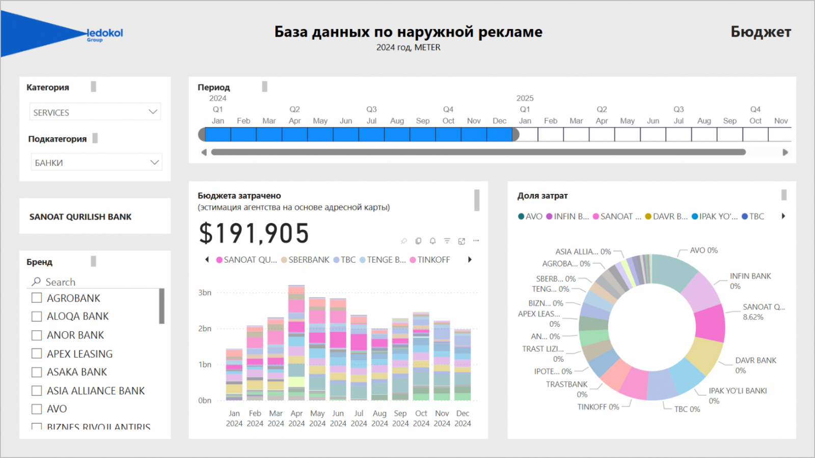 С 3 квартала 2023 года начал внедряться мониторинг наружной рекламы в Ташкенте — теперь у агентств и клиентов появилась возможность отслеживать активность категорий и оценивать долю голоса и прогнозные затраты основных игроков. На сегодняшний день доступен факт размещения за 2024 год (собралась база более 90% размещения с учетом небольшой погрешности) в разрезе категорий. В ближайшие пару месяцев, планируется внедрение библиотеки со всеми креативами, которые размещаются в Ташкенте на LED-экранах.