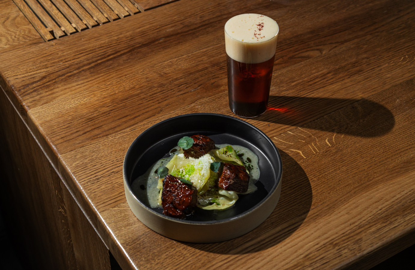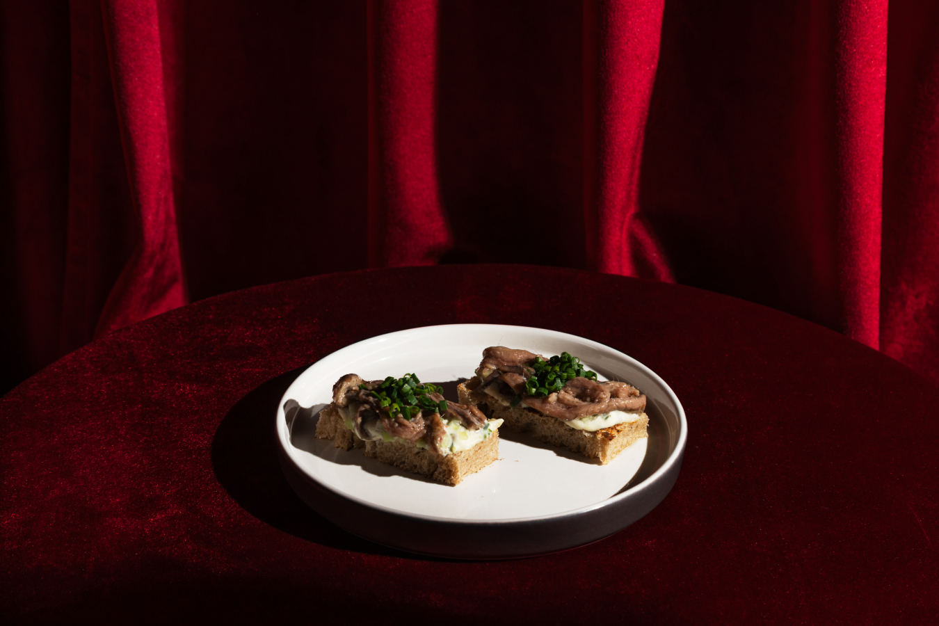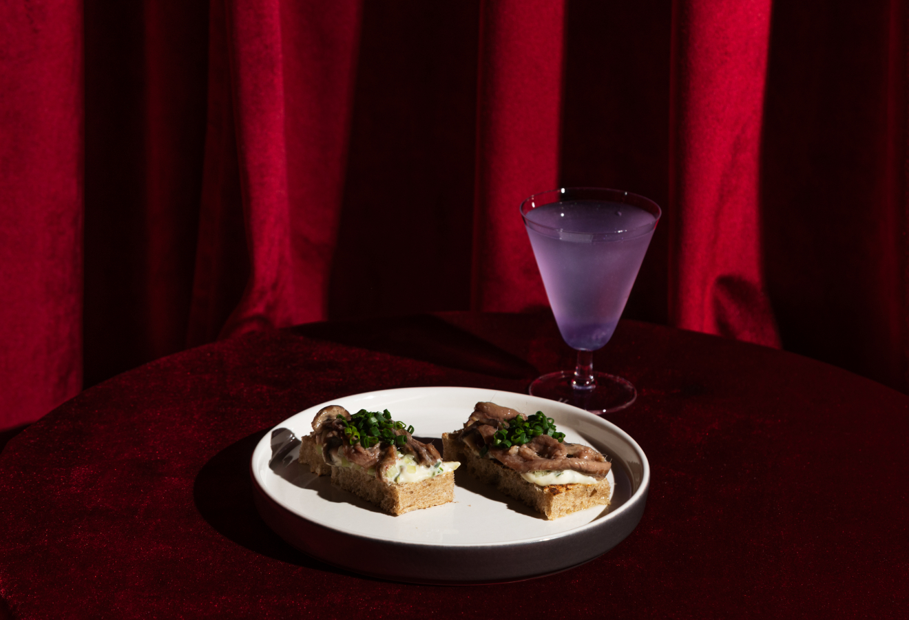 Каждому коктейлю соответствует своя закуска от шефа Алексея Арделяна: крокеты с белыми грибами, швейцарским сыром и трюфельным соусом; томленая телячья лопатка с белокочанной капустой и квасным соусом; тартар из гребешка с аквачили и копченой сметаной; ферментированные анчоусы на ржаном хлебе с соусом ремулад.