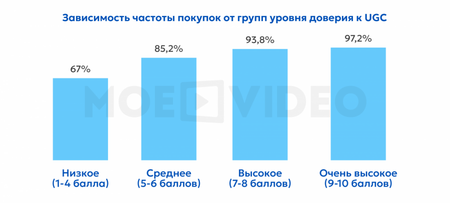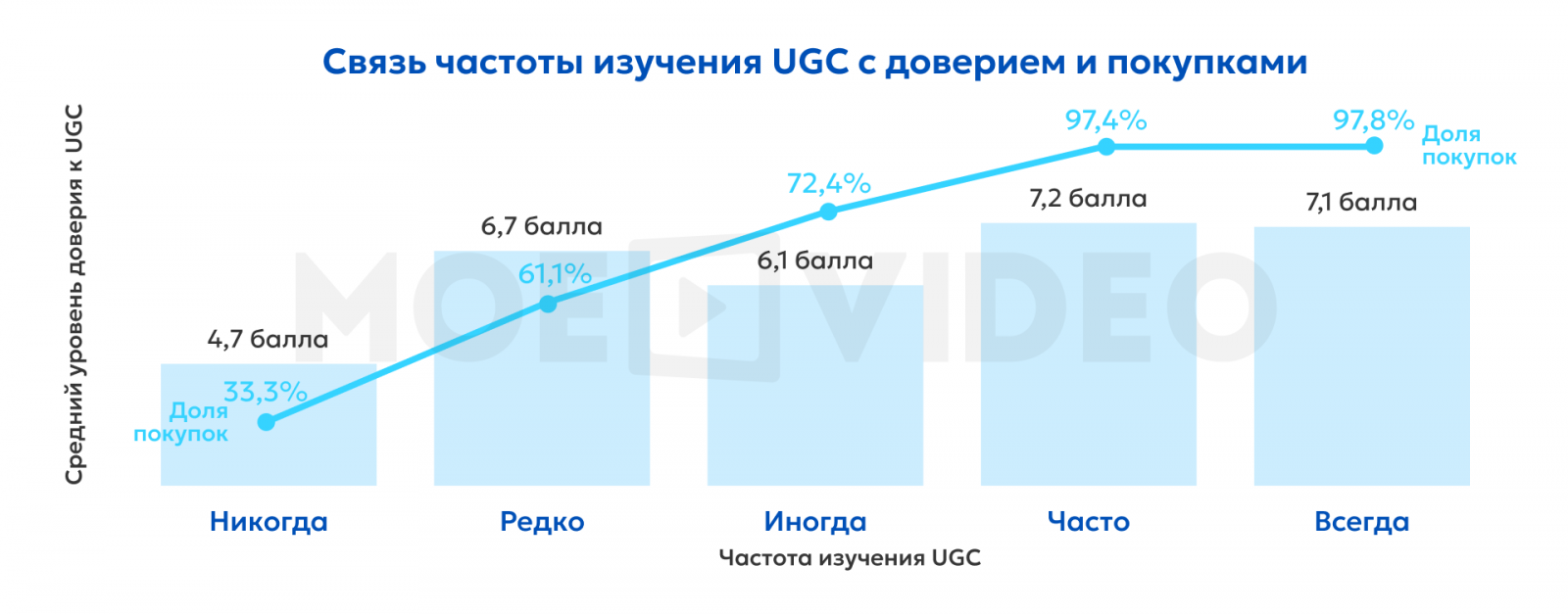 В то же время у аудитории, редко взаимодействующей с UGC, частота таких решений ниже — от 33% до 72%. Это подчеркивает, что устойчивое взаимодействие с пользовательским контентом формирует доверие и повышает его конверсионный потенциал, превращая UGC из дополнительного источника информации в один из триггеров покупки.
