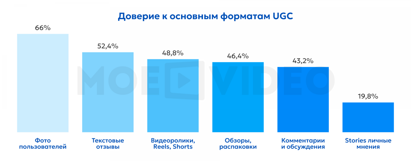 Аудитория воспринимает пользовательский контент не как скрытую рекламу, а как аутентичный и полезный источник информации: средний уровень доверия к UGC составляет около 7 баллов из 10. Особенно высокую вовлеченность демонстрируют женщины и пользователи от 25 до 44 лет — они чаще доверяют, создают UGC и принимают решения о покупке под его влиянием. Наибольшее доверие вызывают фотографии и текстовые отзывы, но любой искренний формат может оказывать влияние.