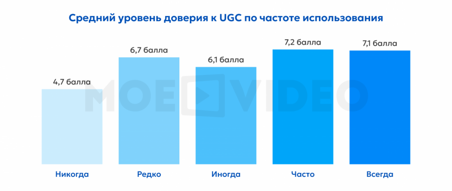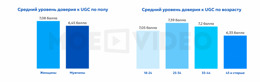 Пользовательский контент чаще находит отклик у женщин: их средняя оценка доверия к UGC составляет 7,1 балла против 6,4 у мужчин. Это, вероятно, связано с тем, что женщины активнее изучают отзывы и опыт других, тогда как мужчины чаще обращаются к альтернативным источникам и проявляют большую осторожность.
