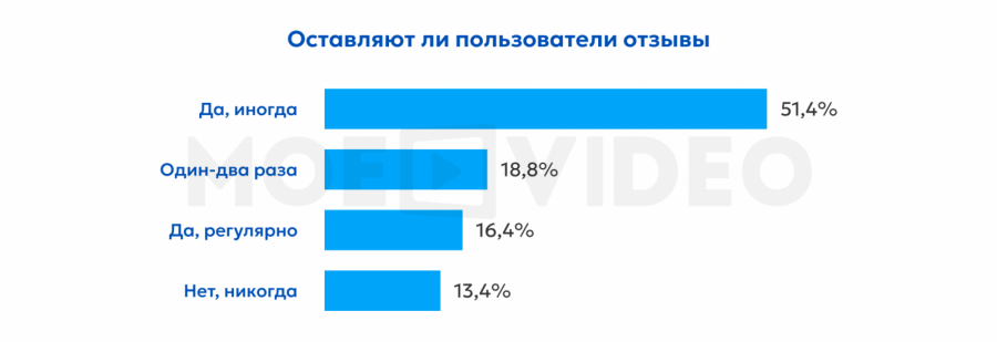 Подавляющее большинство респондентов участвуют в создании пользовательского контента: 86,6% имеют опыт публикации отзывов о товарах или услугах. Из них 16,4% делают это регулярно, 51,4% время от времени, и еще 18,8% оставляли отзывы один-два раза.