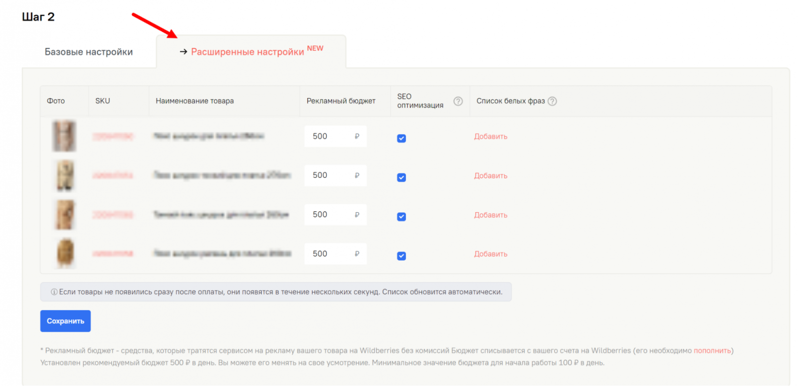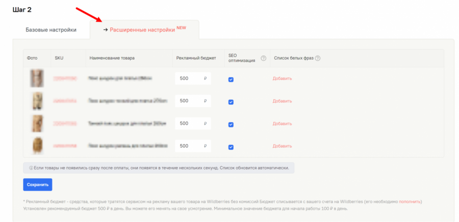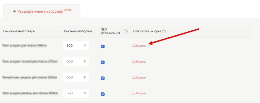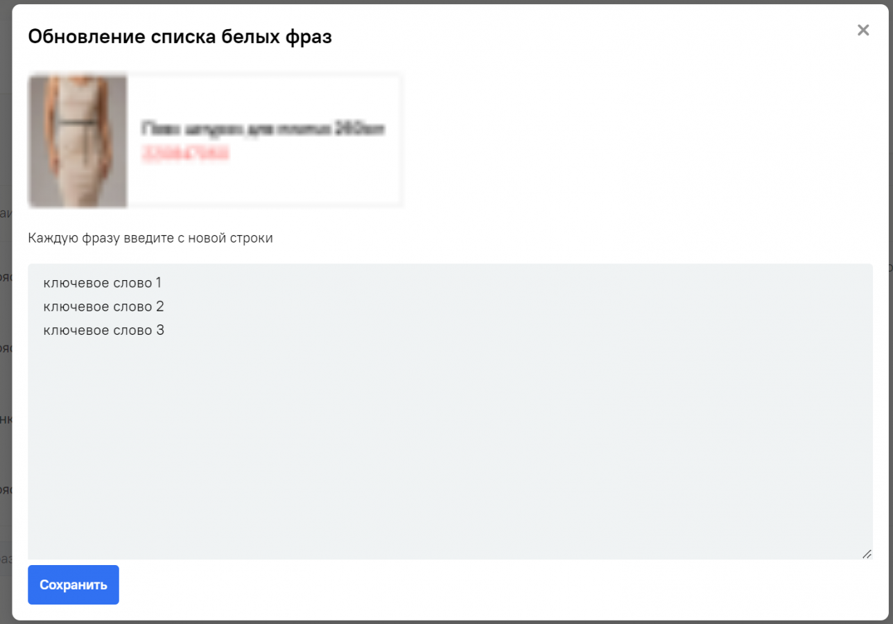 - Если же вы хотите продвигать товар, но по определенным ключевикам, добавьте нужные слова в «Список белых фраз» — сервис начнет показывать рекламу товара по всем кластерам, которые соответствуют ключевым словам из списка.