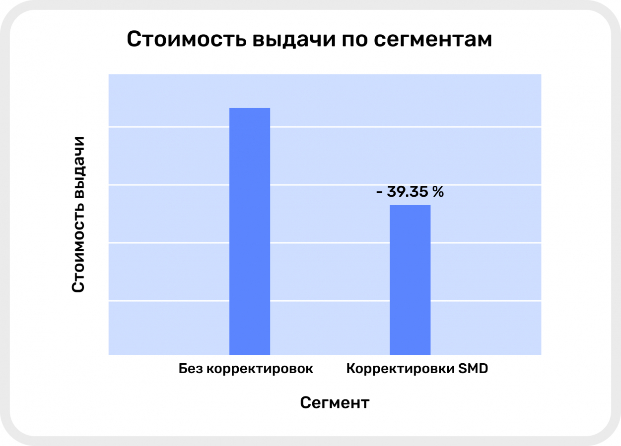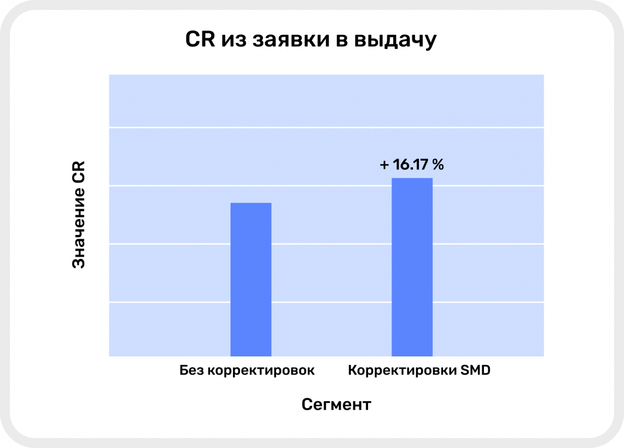 Разработанная система прогнозирования конверсий имеет низкий порог входа для клиентов. Достаточно 24 часов, чтобы получить на руки готовые сегменты пользователей сайта. Результаты данного кейса продемонстрировали положительный эффект в точности предсказаний, позволили снизить стоимость лида и стоимость выдачи займа, а также значительно увеличить значение CR.