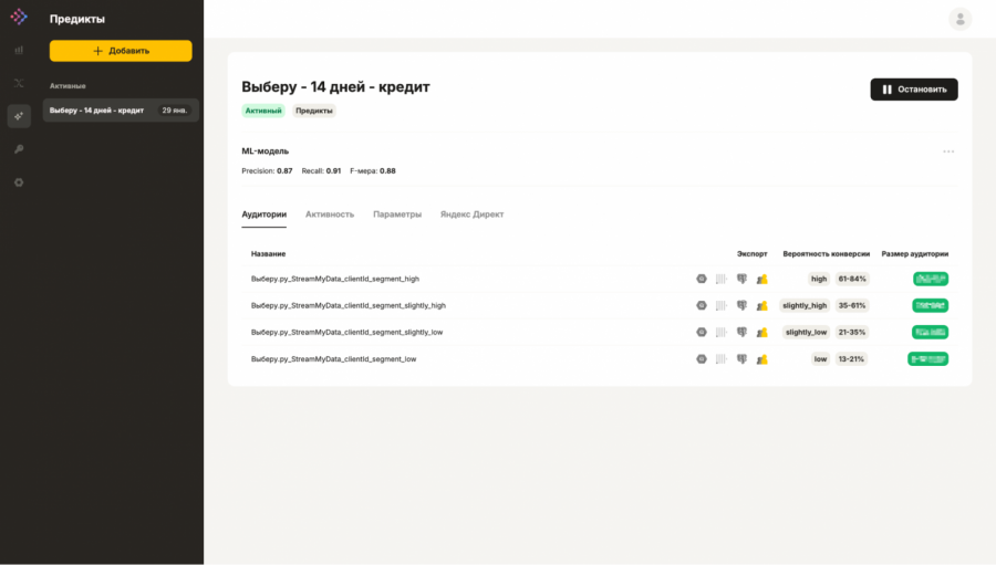 Изначально целью для предсказаний являлась общая конверсия по всем финансовым продуктам «Выберу᎐ру». Сегменты использовались в рекламных кампаниях с применением корректировок ставок.