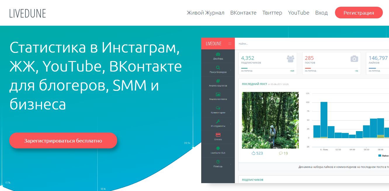 С помощью сервиса LiveDune можно проанализировать аудиторию своих и чужих аккаунтов. Позиционирует себя как крупнейший рейтинг блогеров Instagram, LiveJournal, «ВКонтакте», YouTube и Twitter в России, Украине, Беларуси и других странах. Правда, в начале августа компания объявила о закрытии рейтингов блогеров и поиска Instagram в связи с изменениями политики Instagram и Facebook.