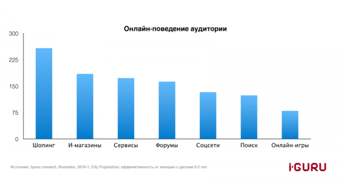 Они пользуются практически всеми интернет-сервисами, проявляя особый интерес к интернет-магазинам. При этом мамы не просто «разглядывают витрины» (хотя, куда без этого), они совершают покупки онлайн. Зачастую, это связано с отсутствием свободного времени и желанием не тратить выдавшуюся спокойную минутку на выезд за покупками, посвятив ее себе. Такой стиль поведения особенно характерен для жительниц крупных городов (Москва, Санкт-Петербург, Екатеринбург и т.д.).