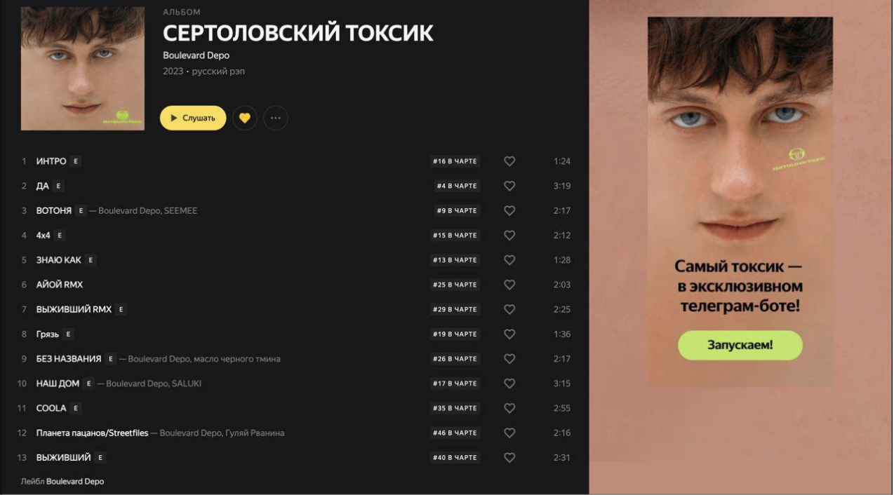 В феврале «Яндекс Музыка» провела кампанию в поддержку нового альбома «Сертоловский Токсик» хип-хоп исполнителя Boulevard Depo. После выхода абсолютно все треки попали в чарт. Один из них — «ДА» — в первые выходные после релиза набрал рекордное количество прослушиваний и занял первое место в Суперлонче — плейлисте, куда попадают самые прослушиваемые новинки уик-энда. «Яндекс Музыка» рассказала, как ей удалось сделать «Сертоловский Токсик» самым успешным альбомом с начала 2023 года.