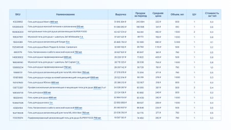 Исследуемый период — с июня 2023 по май 2024 года. В анализе участвовали только гели для душа, а другие похожие товары (жидкое мыло, гели для интимной гигиены, пены для ванны и пр.) в выборку не вошли. Решение было принято по нескольким причинам: