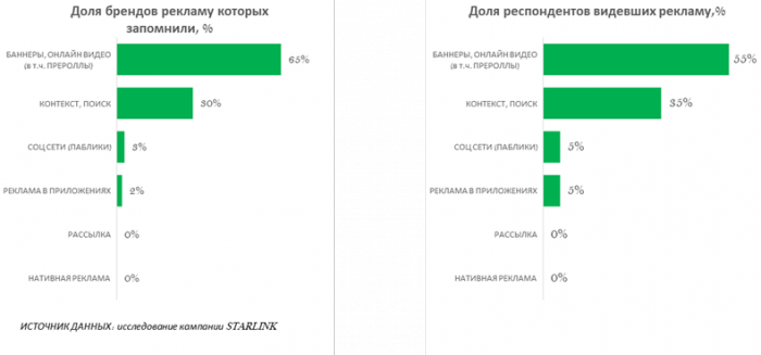 Самыми эффективными форматами рекламы для запоминания бренда оказались баннеры и онлайн-видео. Так, доля брендов, рекламу которых запомнили при помощи онлайн-видео и баннеров, размещенных в Сети, достигла 65%. Контекст с показателями в 30% оказался только на втором месте. Отметим, что при этом доля респондентов, видевших баннерную рекламу достигла показателя в 55%, а контекстную - 35%.