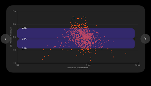 Оптимальный диапазон дочитываний — 20−48%. Если вашу статью дочитывает больше 48% людей — отлично. Если меньше 20% — следует проанализировать текст и посмотреть, что в нем не так. Возможно, в статью стоит добавить списки, подзаголовки и другие элементы управления вниманием читателя.