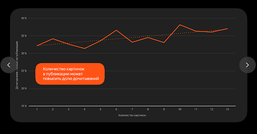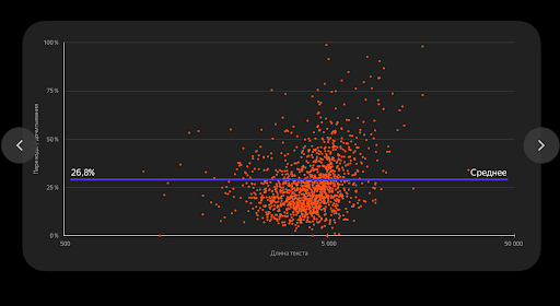 Средняя конверсия у текстов в «Яндекс.Дзене» — 26,8%, и у длинных текстов она повыше. Дело в том, что чем длиннее статья, тем больше шансов рассказать все о продукте и хорошо прогреть читателя. Так что если вам нужны конверсии, пишите длинные тексты — от 4 тыс. до 10 тыс. знаков. В дочитках потеряете, но до конца дойдут те, кому по-настоящему интересен продукт.