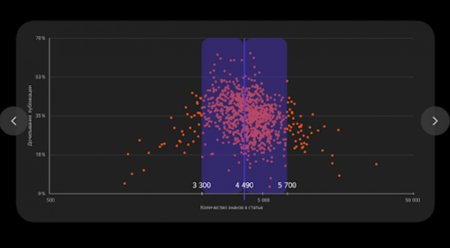 Оптимальный диапазон по длине текста — 3,3−5,7 тыс. знаков. Если вы уложитесь в такой объем, намного выше шанс, что вашу статью дочитают.