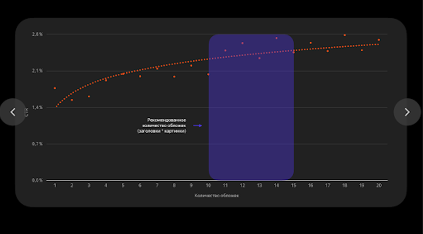 - Оптимально делать 10−15 вариантов одной статьи для A/B-теста: пять заголовков и три обложки.