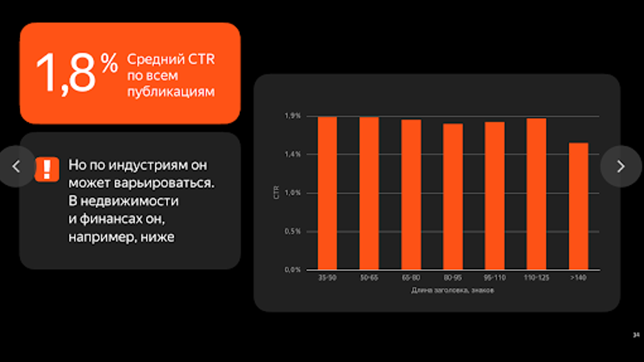 Рекламодатели разделились на два лагеря: кто-то считает, что для увеличения CTR лучше писать длинные заголовки, а для кого-то эффективнее короткие. Средний CTR у проанализированных публикаций — 1,8%, и длина заголовка несильно на него влияет. Поэтому делайте разные заголовки — главное, чтобы они не нарушали правила «Яндекс.Дзена» и не были кликбейтом.