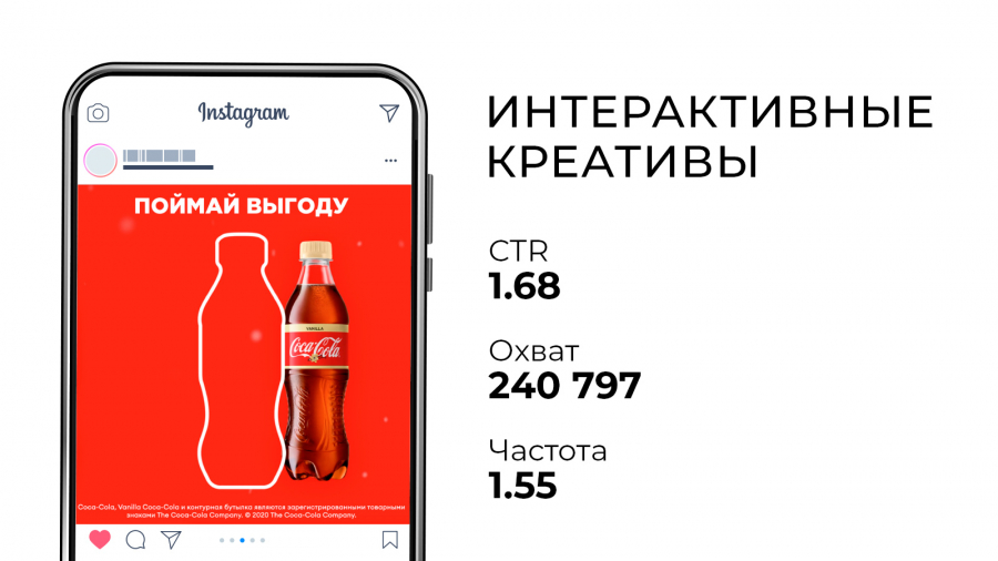 Современные perfomance-кампании — это симбиоз технологий, аналитики и креатива. Необходимо экспериментировать, проводить тесты и анализировать результаты, чтобы видеть картину целиком. Поэтому специализированные креативы разрабатывались на основе экспериментов с вовлечением пользователей. Например, самую высокую коммерческую эффективность показал интерактивный креатив, предлагающий потенциальному покупателю поймать на экране бегающую бутылочку Coca-Cola.