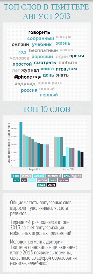 За прошедший год в частотном словаре русскоязычного Твиттера произошли заметные изменения. Список самых используемых терминов (значимых слов и словосочетаний, за исключением предлогов, союзов и других служебных слов, с частотой употребления не менее 1 раза в час) в августе 2012 года был таким: