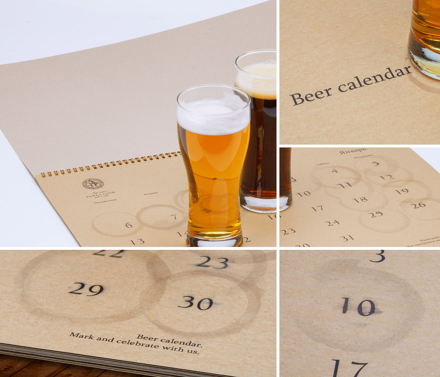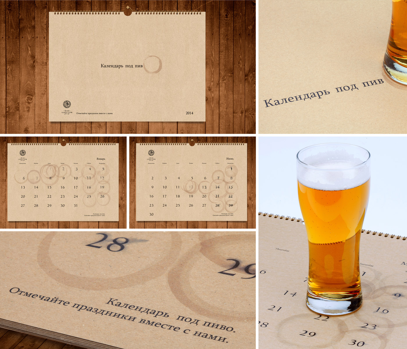 Креативная концепция календаря заключается в том, что все дни, когда есть возможность отдохнуть от дел, выделены на нем узнаваемым следом от пивной кружки.