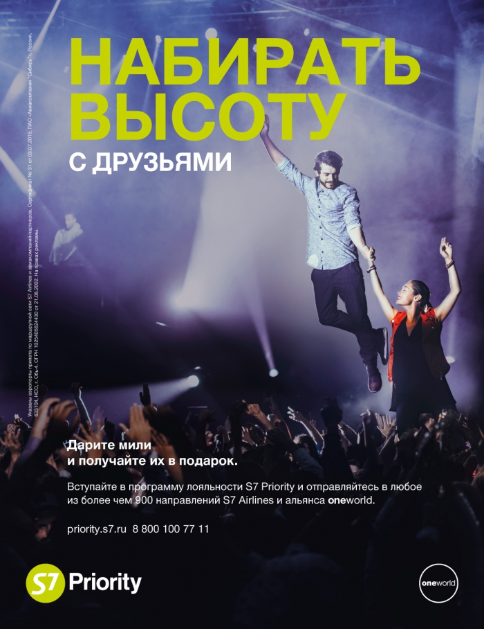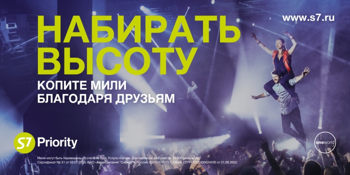 Один из самых креативных российских рекламодателей - авиаперевозчик S7 Airlines - представил новую рекламную кампанию «Набирать высоту». Это не имиджевый проект, как в случае с #ХОЧУТУДАГДЕ - новая кампания демонстрирует преимущества программы лояльности S7 Priority.