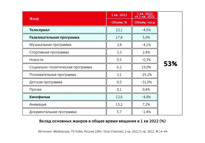 Несмотря на возросший интерес всего населения к новостям в 2022 году, люди по-прежнему нуждаются в привычном развлекательном контенте: кино, шоу, передачи и телесериалы. На них приходится почти 53% эфирного времени. Объём кино и сериалов сократился по сравнению с первым кварталом прошлого года, на фоне чего стал заметен прирост развлекательных программ.