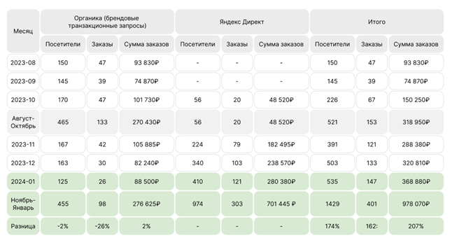 Пик по посетителям пришелся на ноябрь, а потом пошел на спад, в то время как наша брендовая кампания показала максимальные результаты в декабре-январе. Таким образом, мы убедились, что брендовая кампания не канибализирует органику, а приносит дополнительную аудиторию и заказы за счет первых позиций в выдаче и новых возможностей для контакта с заинтересованной аудиторией.