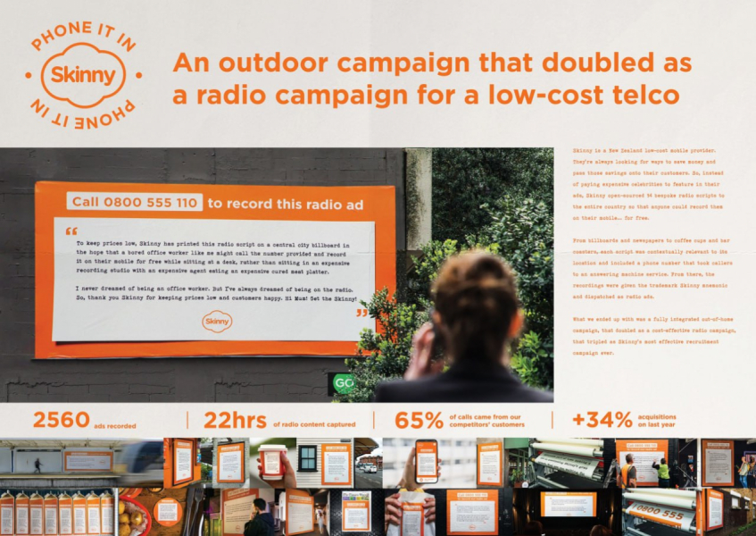 Мобильный провайдер Skinny решил не платить селебрити для привлечения аудитории. Вместо этого он разместил наружку с просьбой позвонить по номеру и прочитать вслух скрипт с билборда. Аудиообращения прохожих были представлены в радио-эфире.