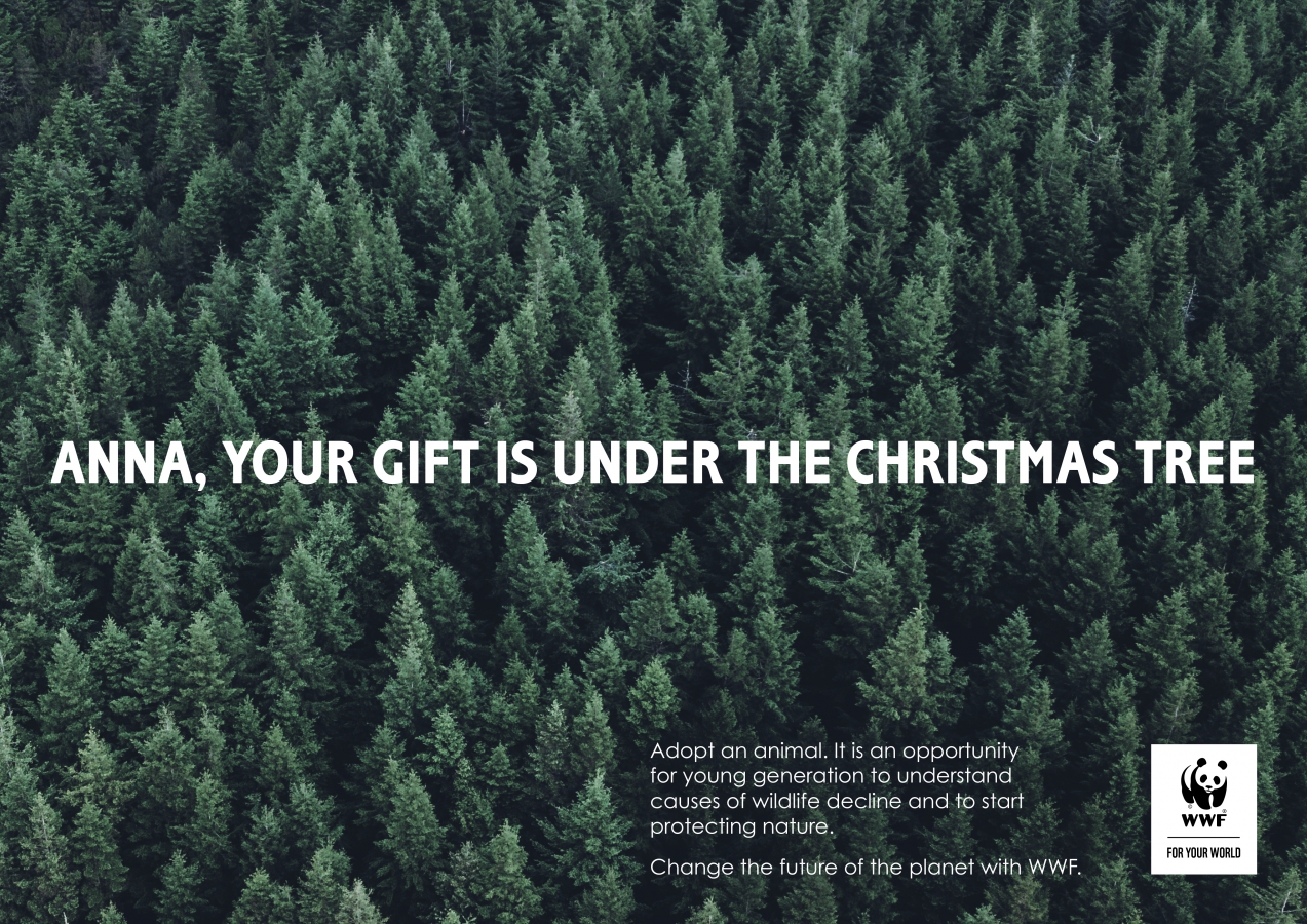 С помощью печатной рекламы необходимо было рассказать о возможности оформить подписку на помощь диким животным. Но не просто оформить, а использовать ее в качестве подарка детям на Рождество. Такой настоящий подарок, который отличается от всего, что обычно дарят детям. Настоящий сюрприз и помощь природе.