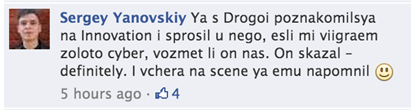 Ну и наконец, вечером в среду смогли отличиться и молодые львы из московского агентства Proximity: Олег Савчук и Сергей Яновский завоевали золотую награду в номинации Cyber young lions. Перед ребятами стояла задача убедить молодых спортсменов в интернете позабыть о таких шалостях как допинг и заниматься спортом по-честному. Паре креаторов удалось разработать очень простое и рабочее решение. В своем фейсбуке Сергей Яновский (которому по случаю победы, похоже, пришлось арендовать пиджак и рубашку) делится историей о том, как Дэвид Дрога лично пообещал взять пару победителей Young Lions на стажировку в агентство Droga5 NY.