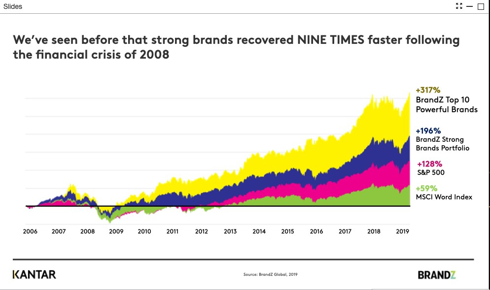 В пример компания приводит кризис 2008 года. Тогда самое быстрое восстановление показывали компании, которые не сокращали свои рекламные бюджеты во время кризиса вовсе. Наиболее сильные бренды восстанавливались в девять раз быстрее.