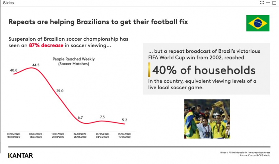 Эксперты Kantar также пришли к выводу, что люди очень скучают по спортивным трансляциям. Например, повтор на Бразильском ТВ Чемпионата Мира 2002 года, где Бразилия выиграла, имел те же ТВ-рейтинги, что и рейтинг среднестатистического прямого эфира национального чемпионата.