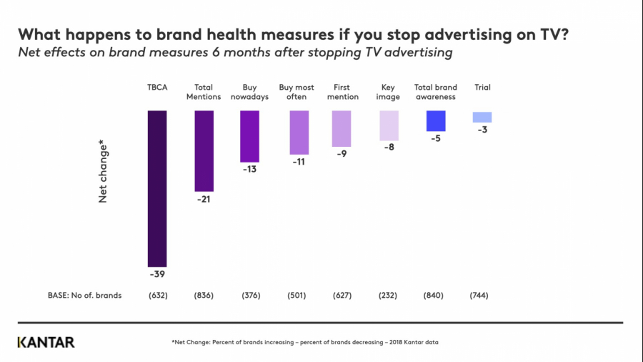 Несмотря на кризис и сокращение бюджетов, совсем отказываться от рекламы на ТВ не стоит. По данным Kantar, приостановка телевизионной рекламы на 6 месяцев приводит к неблагоприятным последствиям с точки зрения восприятия бренда.