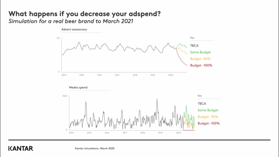 Полное же снятие рекламных бюджетов может критически сказаться на узнаваемости. Максимальный уровень сокращения рекламного бюджета, который позволит в дальнейшей восстановиться, это 50% от докризисного, считают в Kantar.