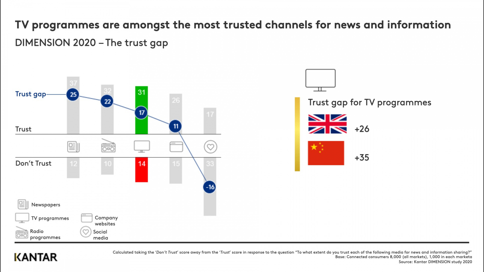 Кроме того, исследование Kantar показало, что уровень доверия к ТВ в кризисных ситуациях растет, а к социальным сетям падает. В доверии телевидение обошли только такие источники информации, как бумажная пресса и радио.