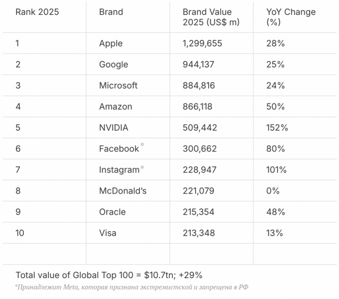 Первую строчку рейтинга вновь заняла американская компания Apple. Оценка стоимости бренда компании достигла практически 1,3 трлн долларов — это на 28% больше по сравнению с прошлым годом. Google занял второе место со стоимостью нематериальных активов 944 млрд долларов (+25% за год), Microsoft — на третьем месте с 884 млрд долларов (+24%). Amazon расположился на четвертой строчке, показав рост стоимости на 50% — до 866 млрд долларов. Компания упрочила свои позиции благодаря фокусу на удобстве и доступности, что обеспечило ей процветание даже в условиях экономической нестабильности. Топ-5 замыкает производитель чипов Nvidia, который увеличил стоимость бренда сразу на 152% — до 509 млрд долларов. Этот результат стал самым впечатляющим в рейтинге, что отражает растущий мировой интерес к разработкам в области ИИ и высокопроизводительных вычислений.