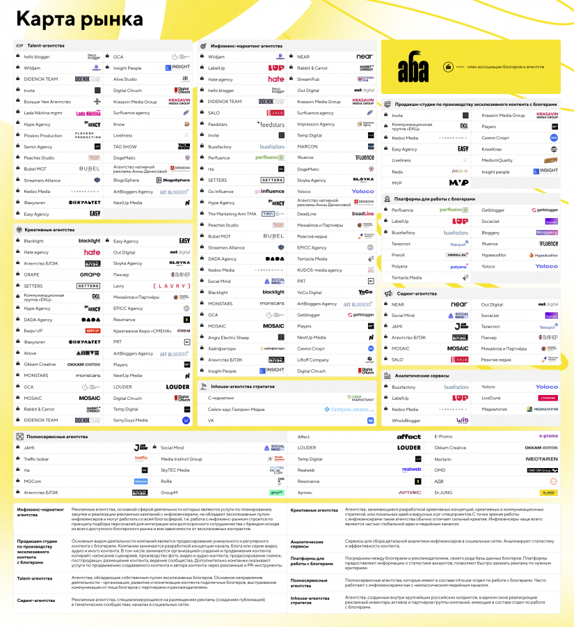 Ассоциация блогеров и агентств (АБА) презентовала новую карту рынка инфлюенс-маркетинга, которая включает 112 агентств, студий, платформ и сервисов. Об этом Sostav рассказали в пресс-службе ассоциации.