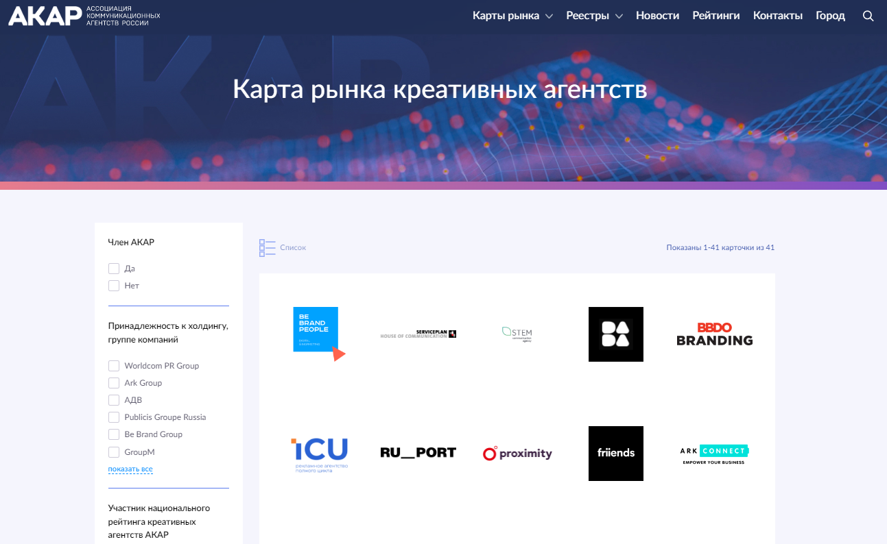 Ассоциация коммуникационных агентств России (АКАР) составила карту рынка креативных агентств в России. В ней агентства распределены по национальному и локальному виду членства в АКАР, принадлежности к холдингам. Как пояснили Sostav в АКАР, встроенные фильтры позволяют найти участников и лидеров рейтингов креативности и эффективности ассоциации.