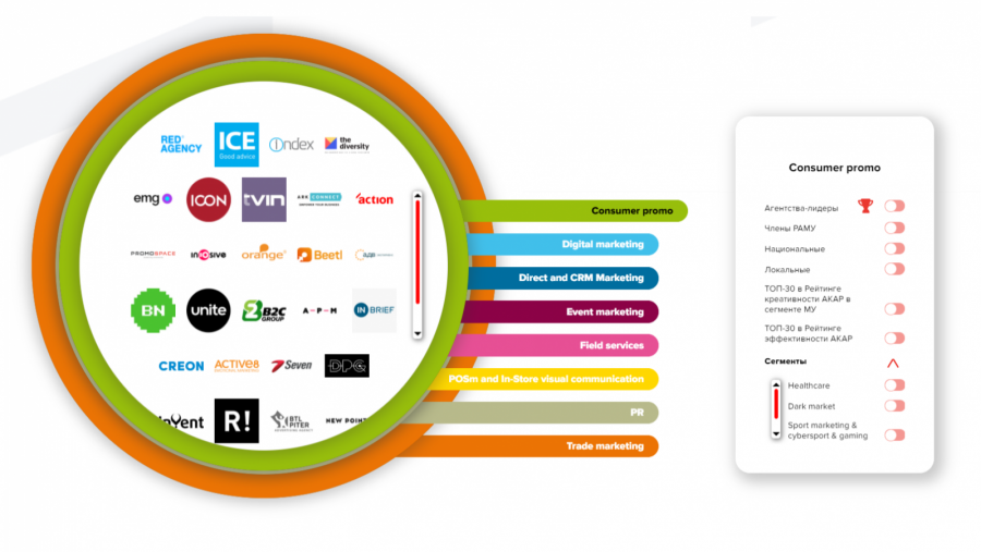 Карта позволяет найти участников с нужной специализацией: Consumer promo, Digital marketing, Direct and CRM Marketing, Event marketing, Field services, POSm and In-Store visual communication, PR и Trade marketing. С помощью фильтров можно выбрать национальные или локальные агентства, членов РАМУ и участников рейтингов АКАР, а также сегмент, в котором работает компания: Healthcare, Dark market, Sport marketing & cybersport & gaming и госсектор.