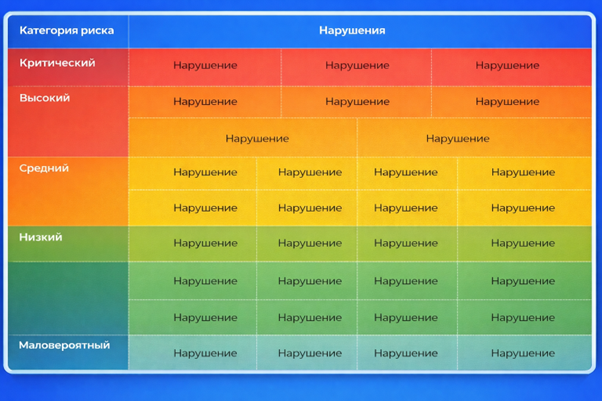 К критическим относятся нарушения с высокой значимостью последствий — например, способные повлечь крупные штрафы, судебные споры или ущерб для репутации компании. Эти риски требуют первоочередного контроля и повышенного внимания.